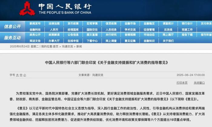 6月24日消息,近日,中国人民银行、国家发展改革委、财政部、商务部、金融监管总局、中国证监会等六部门联合印发《关于金融支持提振和扩大消费的指导意见》(下称《意见》),从支持增强消费能力等六个方面提出19项重点举措。
